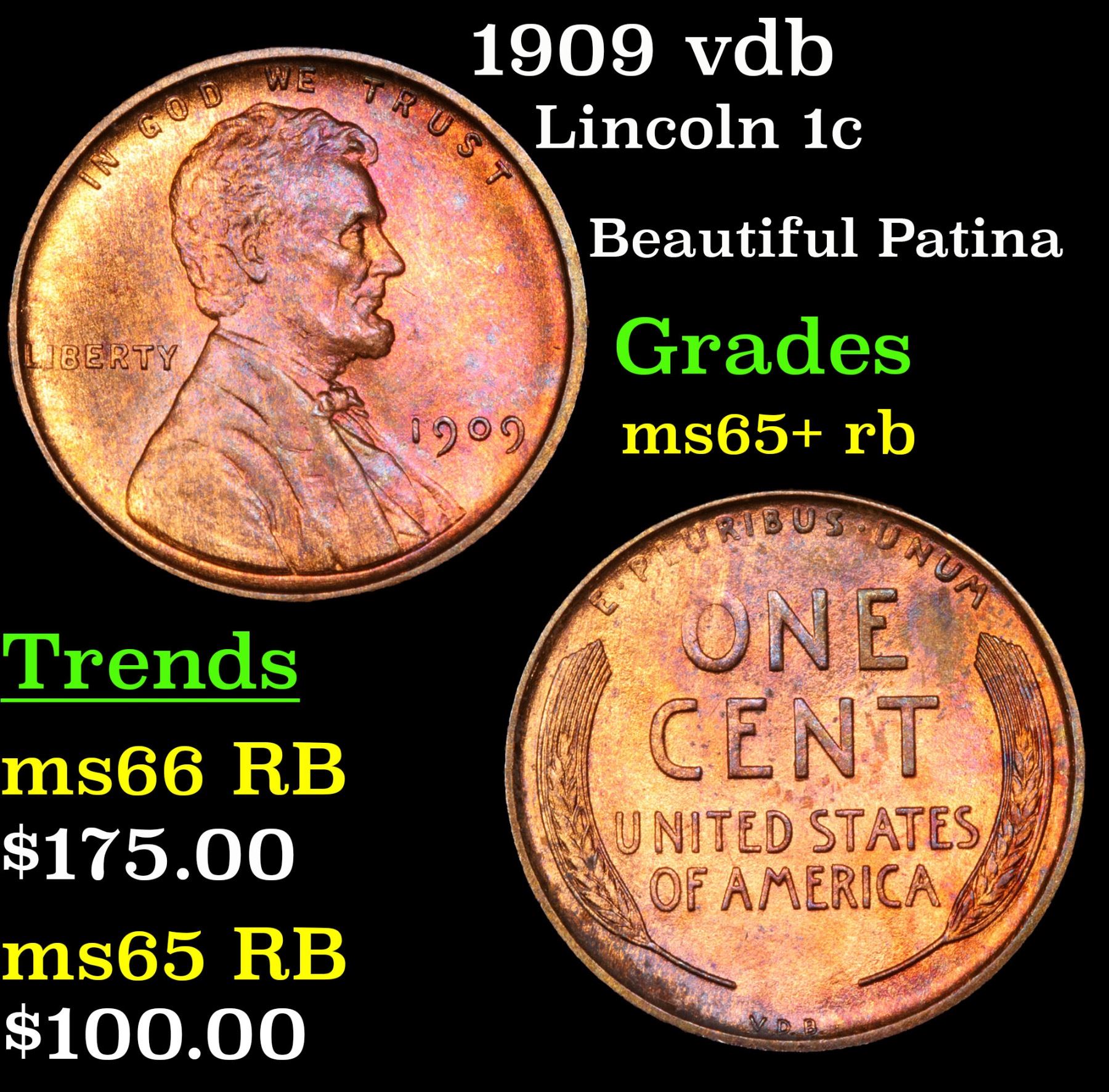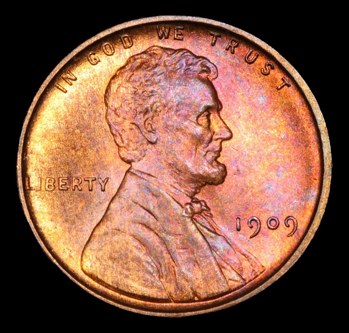 1909 vdb Beautiful Patina . Lincoln Cent 1c Grades Gem+ Unc RB. Always sought after date. Always popular.