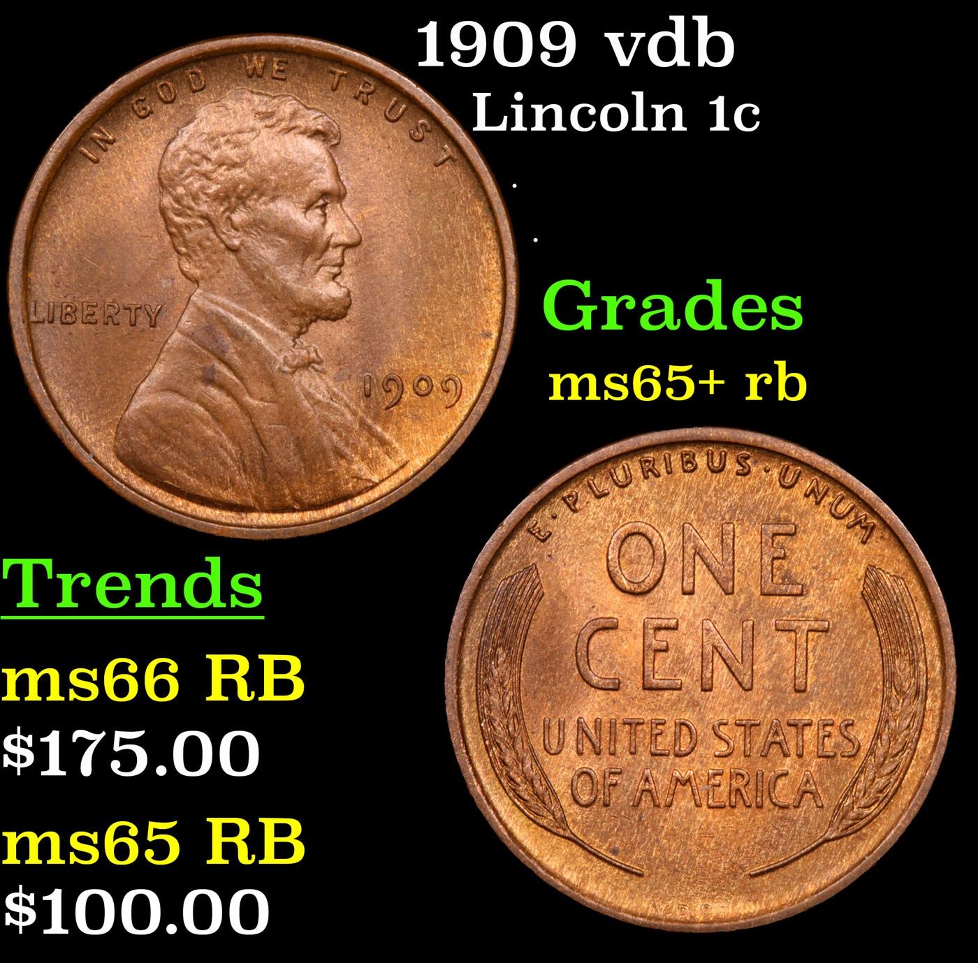 1909 vdb Lincoln Cent 1c Grades Gem+ Unc RB. Always sought after date. Always popular.