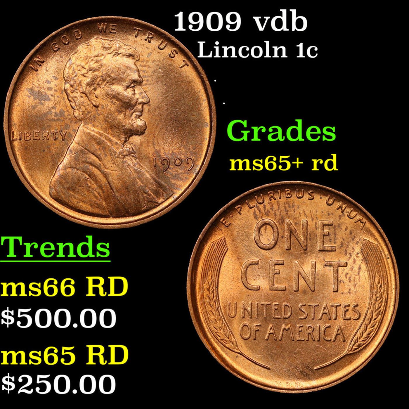 1909 vdb Lincoln Cent 1c Grades Gem+ Unc RD. Always sought after date. Always popular.