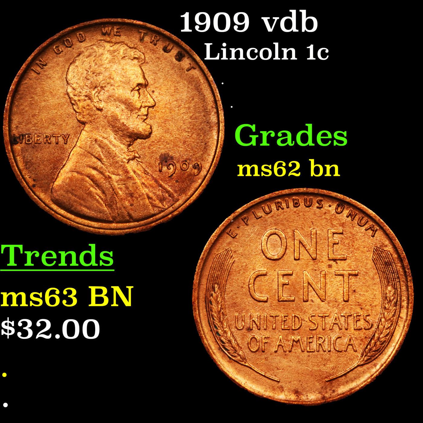 1909 vdb Lincoln Cent 1c Grades Select Unc BN. Always sought after date. Always popular.