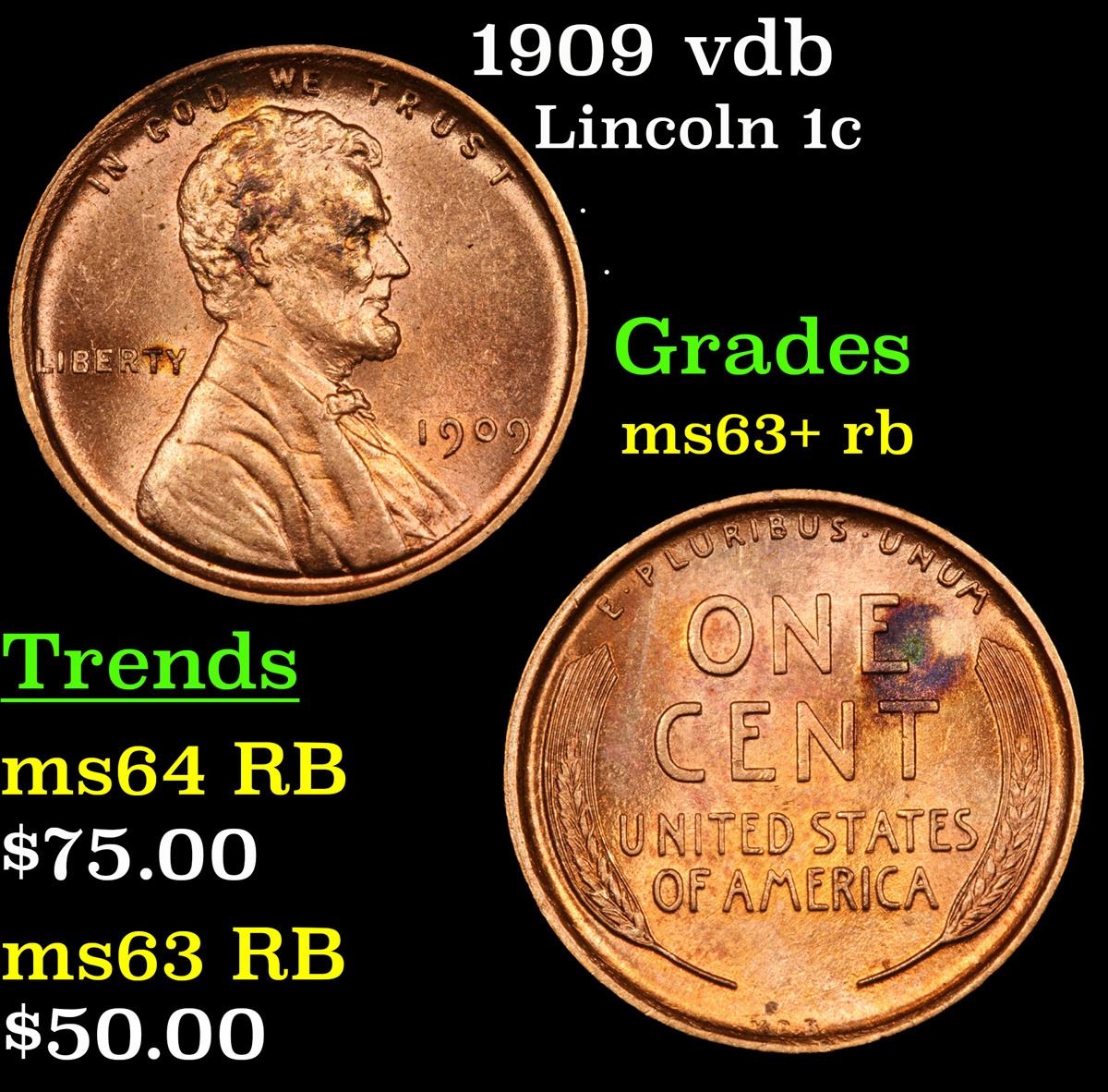 1909 vdb Lincoln Cent 1c Grades Select+ Unc RB. Always sought after date. Always popular.