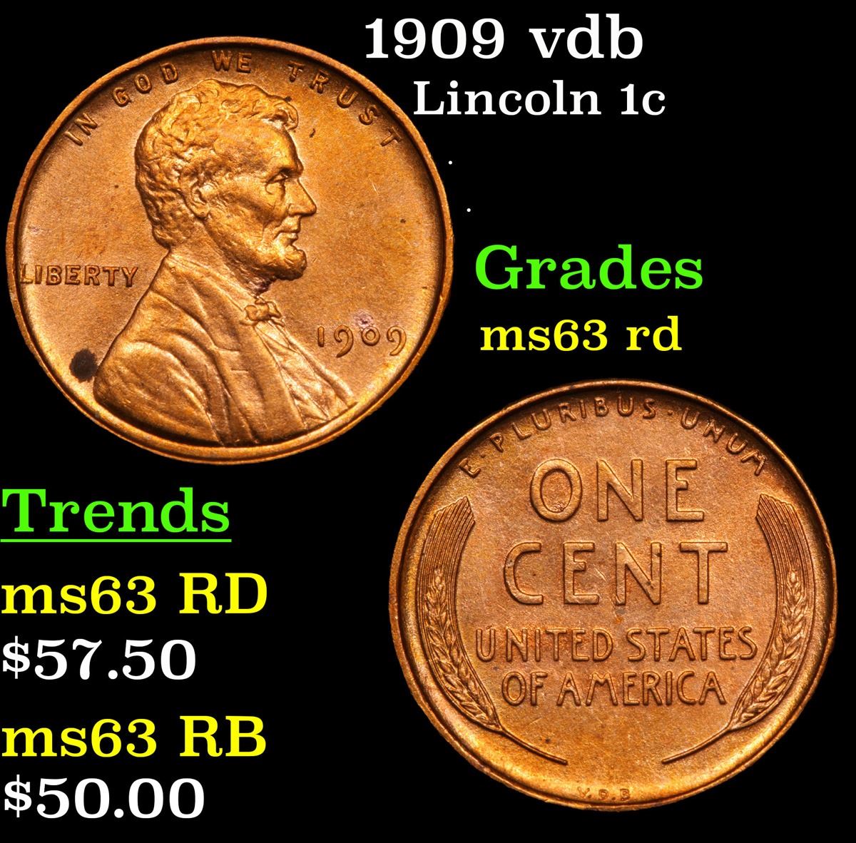 1909 vdb Lincoln Cent 1c Grades Select Unc RD. Always sought after date. Always popular.