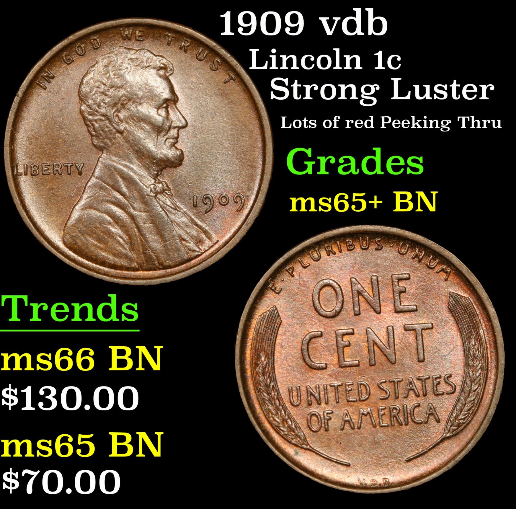 1909 vdb Strong Luster Lots of red Peeking Thru Lincoln Cent 1c Grades GEM+ Unc BN. Always sought after date. Always popular.