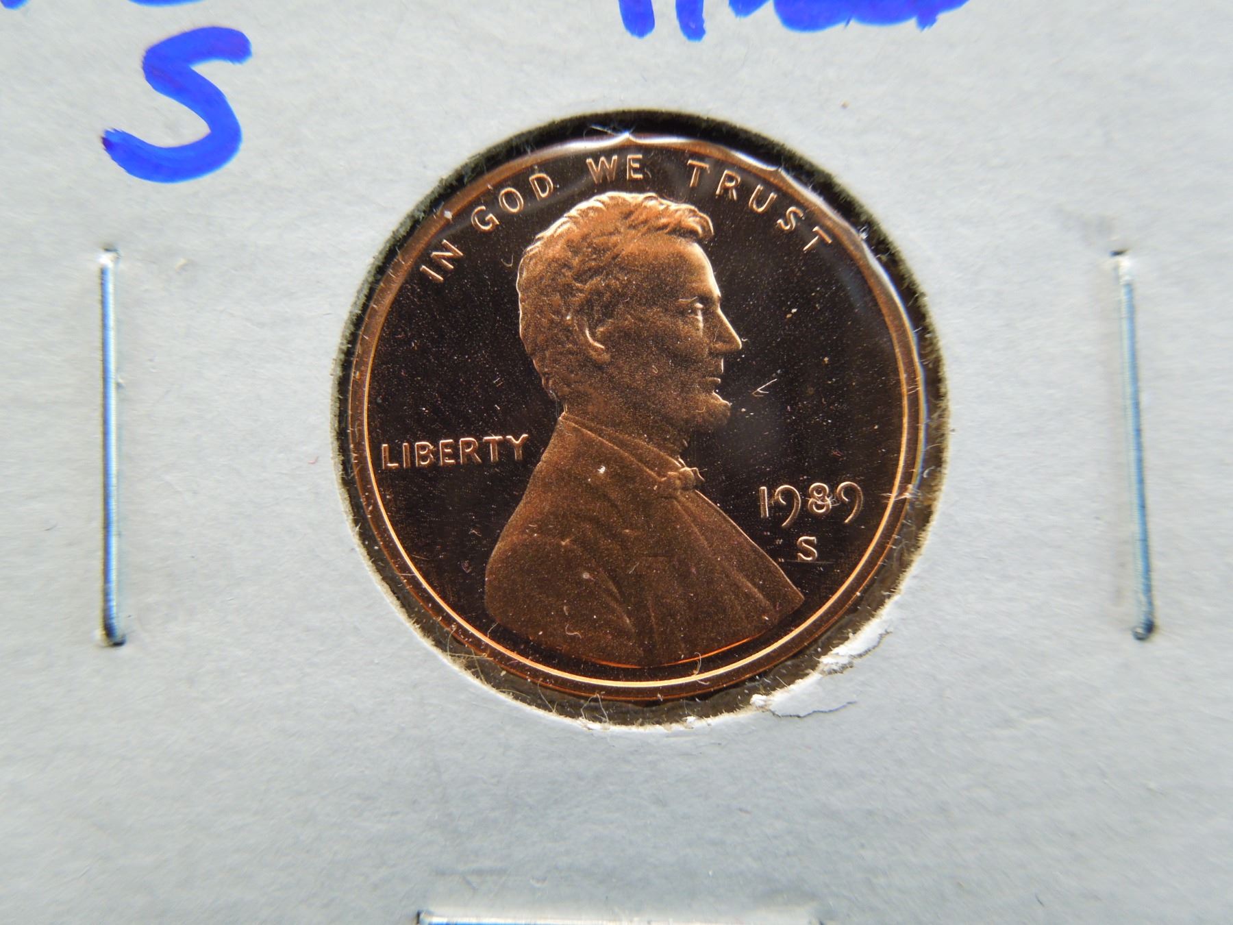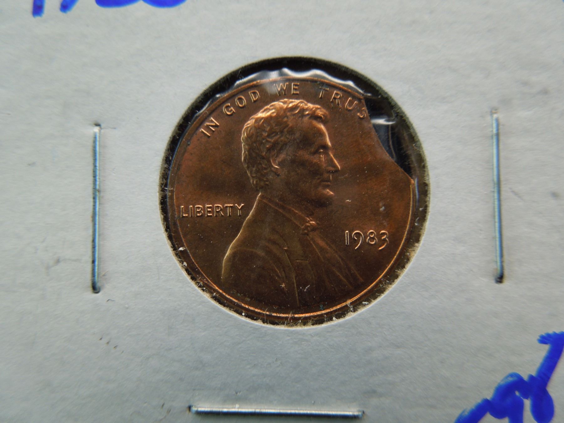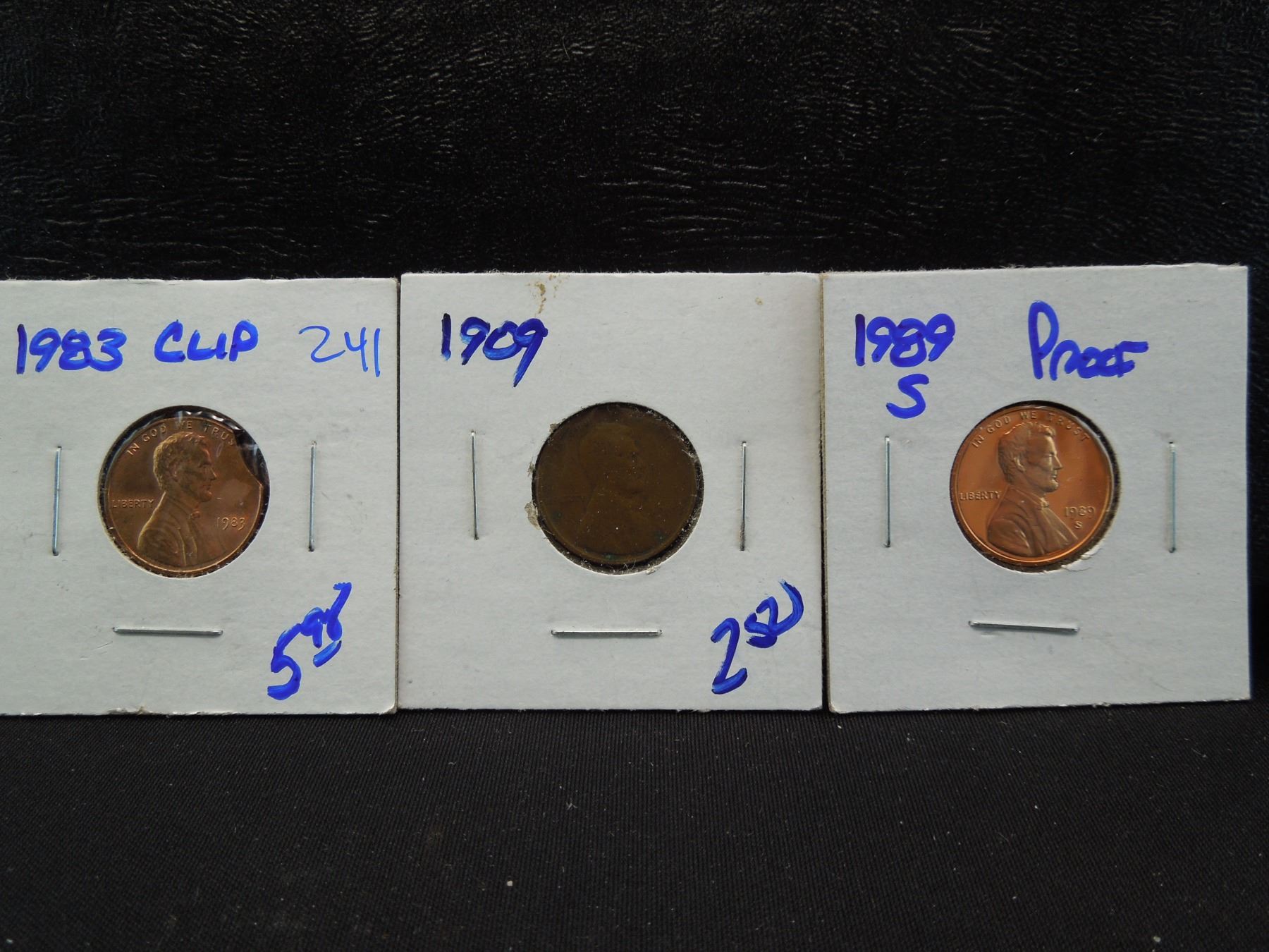 1909 wheat cent, 1983 memorial cent error coin with a rim clip, and a 1989-s proof memorial cent