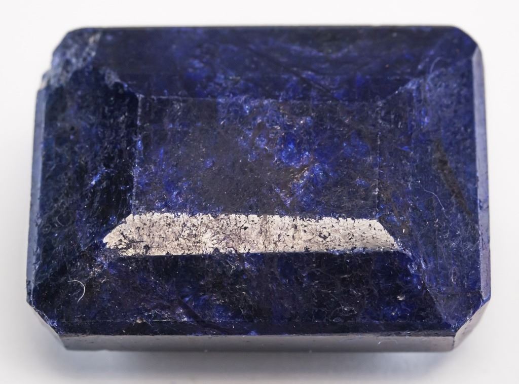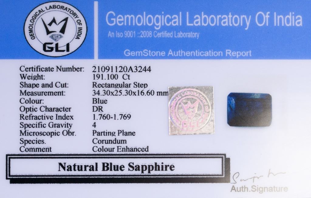 191.10 ct rectangular step cut blue natural sapphire. Accompanied with GLI certificate. 34.30 x 25.30 x 16.60 mm.
