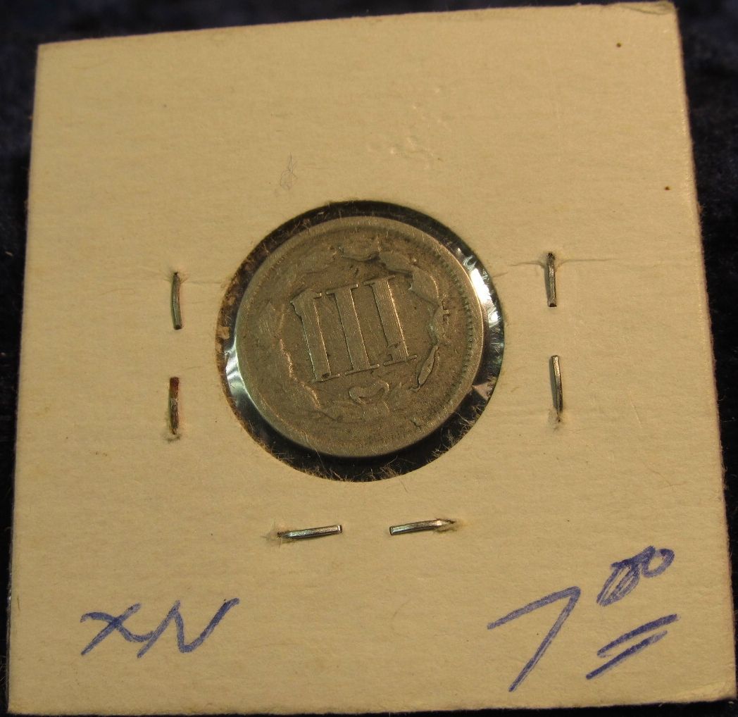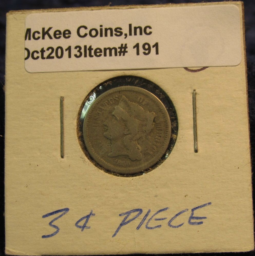 191. 1866 U.S. Three Cent Nickel. VG-8. Redbook value $20.00.