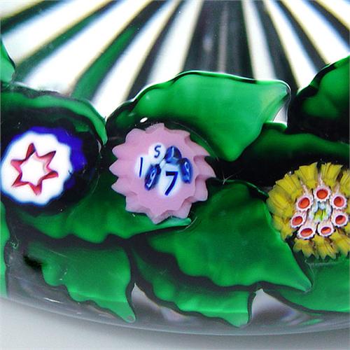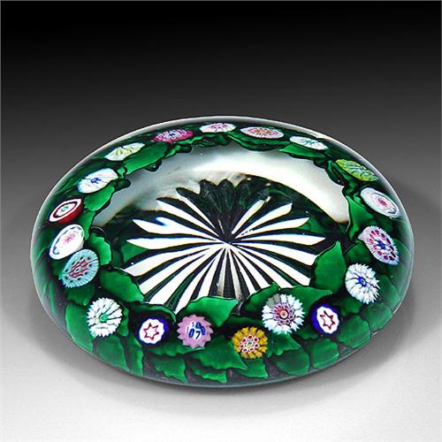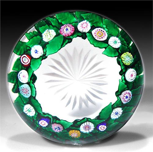 Saint Louis 1979 low-domed garland of millefiori flowers paperweight. The piece contains spaced complex cane flowers, on a ring of dark green leaves, over clear star-cut ground. Signature/date cane. Limited edition of 250. Diameter 2 15/16". NO RESERVE