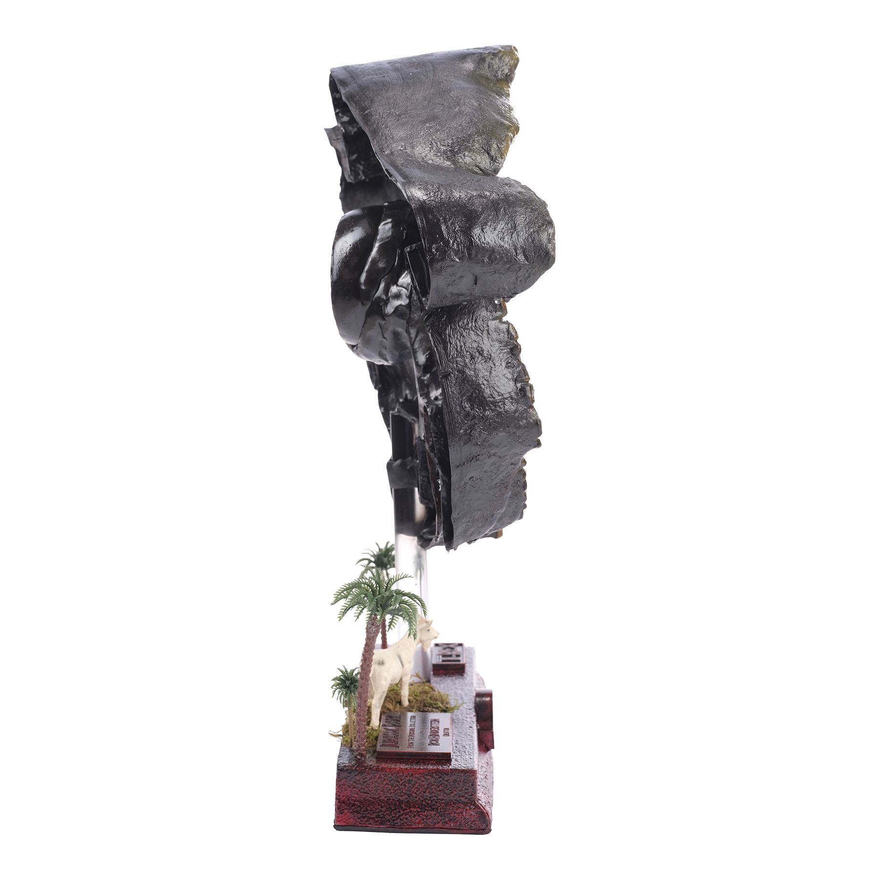 Created post-production, this ornately detailed T-Rex eye with a sculpted yellow and black core, lifelike yellow and brown latticework veins, and a dental acrylic coating was created by key artist Rob Hinderstein at Stan Winston Studios. During production, the eye was inserted into a hand-painted and hand-textured foam and resin T-Rex socket display to demonstrate the dinosaur's potential eye movements to Spielberg. This lot comes on a custom-made, red and black painted resin foam display mounted on a clear acrylic rod. The display is decorated with miniature palm trees, a goat, artificial moss, and two plaques with one inscribed "Jurassic Park from the personal collection of Rob Hinderstein Creator" and one inscribed "T-REX" with a Jurassic Park logo. This lot exhibits minor scuffing to the back of the display. Dimensions: 16" x 6" x 19.75" 940.75 cm x 15.25 cm x 50.25 cm)