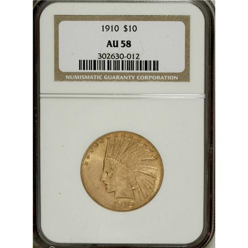 1910 $10 AU58 NGC. NGC Census: (318/2887). PCGS Po