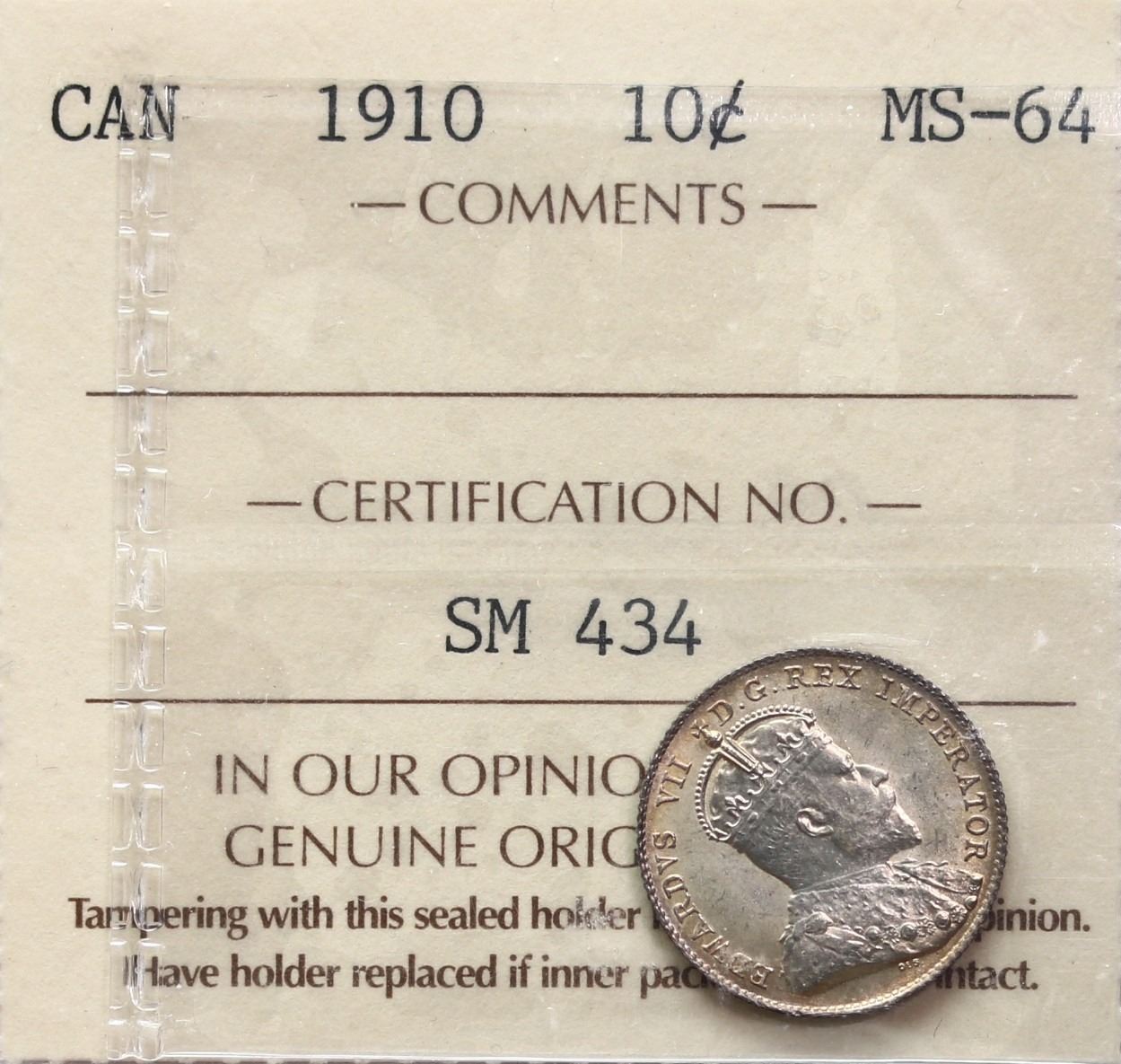 1910 10¢ ICCS Choice Mint State-64 Light gold and russet tones over full underlying lustre.