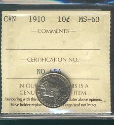 1910 10¢ ICCS MS63. Scattered gold tones with strong lustre.