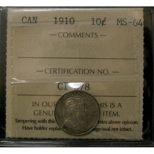 1910 10¢ ICCS MS64 PQ+.Attractive toning over full underlying luster. Excellent strike with clean fields and lovely surfaces.