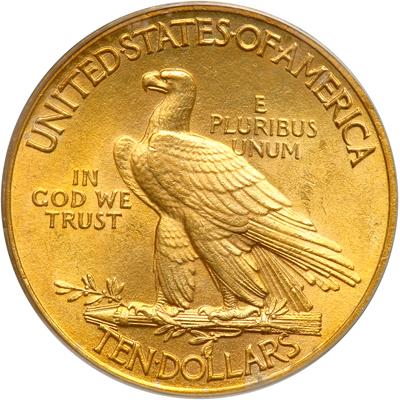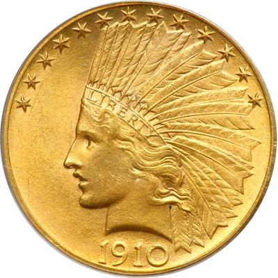 1910 $10 Indian. PCGS graded MS-64. Nice even golden toning on both sides. Heavy with golden frost from top to bottom, this is an outstanding example of the Type and date. To get some idea just how far $10 went in those days, in 1914 Henry Ford gave a pay raise to all his Ford Motor Company assembly line workers. In an era when there were no taxes withheld from paychecks, the pay for an 8-hour day was $5 (in gold) (PCGS # 8865).