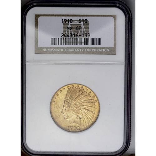 <B>1910<$10> MS62 NGC.</B></I> A frosty Mint State example with brown high point toning over lustrous yellow-gold surfaces.