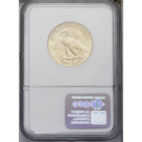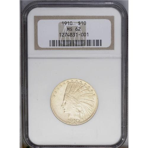 <B>1910<$10> MS62 NGC.</B></I> A lovely and lustrous straw-gold representative, interesting for a prominent obverse wire rim between 1 and 7 o'clock. Minor abrasions here and there do not deny the eye appeal. <BR><BR><B>Important notice:</B> Heritage usually auctions material at the rate of 200-250 lots per hour. On some occasions eBay Live bid software or the Internet may not be able to keep up with the pace of the auction. We recommend placing a realistic absentee bid now as insurance to avoid disappointment. Occasionally the auctioneer may eliminate or reject an eBay Live bid, and the auctioneer may also reopen a lot after the close of the eBay live bidding (usually because we missed an audience bid), and may reject your bid even if it shows you as the winning bidder. By bidding via eBay Live, you agree that Heritage may award the lot to another bidder at its sole discretion under the circumstances described above or any other reasonable circumstances. Since eBay bids are not shown to us until we open the lot on the floor, we treat those bids just like floor bids. In most cases the floor responds before the eBay bid is presented to us, due to Internet lag time, so for consistency we have made it a policy that floor bids are always considered first over tie eBay live bids. Also please note that all Heritage lots purchased through eBay Live carry a 20% Buyer's Premium. Please make sure you read the Terms and Conditions before you bid. This lot is being auctioned in conjunction with a live floor auction by Heritage Galleries & Auctioneers. All final auction and invoice information will be supplied by Heritage Galleries & Auctioneers, and all other information should be considered preliminary. Lot:4114 <BR><BR><B>Winning Notification and Billing:</B> After the FINAL session in this auction is complete, Heritage will send e-mail and snail mail invoices. This process normally takes several days. All final auction and invoice information will be supplied by Heritage Galleries & Auctioneers, and all other information should be considered preliminary. <BR><BR>This auction will be conducted on a live auction floor and over the Internet through eBay Live. If you choose to place an absentee bid, please take a moment to <font color='#0000ff'><u><a href='http://pages.ebay.com/liveauctions/help/before/laabsentee.html'>learn how eBay Live absentee bidding works</a></u></font><font color='#000000'>