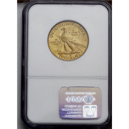 <B>1910<$10> MS62 NGC.</B></I> Lustrous golden surfaces with minor obverse and reverse abrasions. Considerable brown toning is evident on the high points of the design.