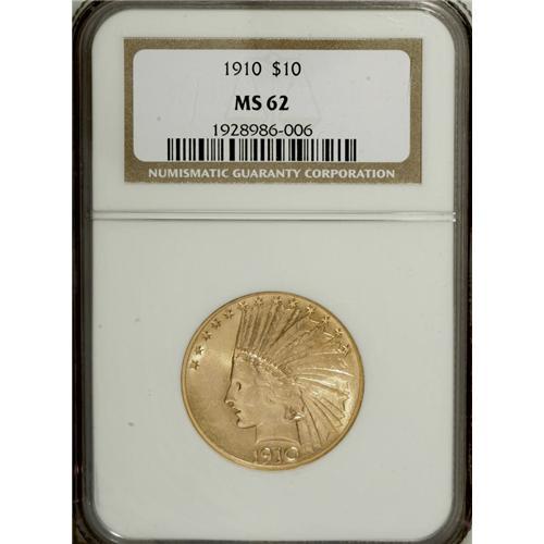 <B>1910 $10 MS62 NGC.</B></I> NGC Census: (2178/1814). PCGS Population (882/765). Mintage: 318,500. Numismedia Wsl. Price for NGC/PCGS coin in MS62: $1,100. (#8865)<BR><BR><b>Shipping:</b> Coins & Currency (<a target="_blank" href="http://www.heritageauctions.com/common/shipping.php">view shipping information</a>)