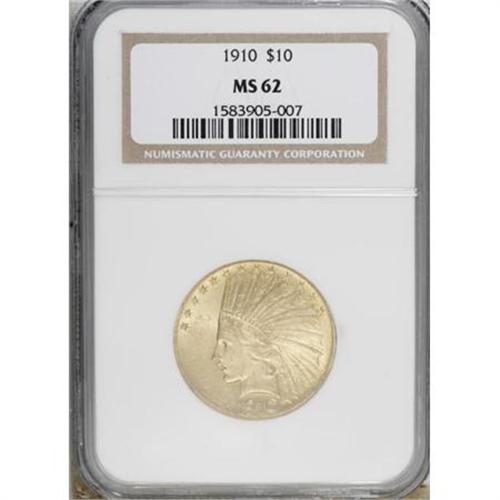 <B>1910 $10 MS62 NGC.</B></I> NGC Census: (1147/953). PCGS Population (920/789). Mintage: 318,500. Numismedia Wsl. Price for NGC/PCGS coin in MS62: $1,100. (#8865)<BR><BR><B>Coin Engraver:</B> Augustus Saint-Gaudens<BR><BR><b>Shipping:</b> Coins & Currency (<a target="_blank" href="http://www.heritageauctions.com/common/shipping.php">view shipping information</a>)