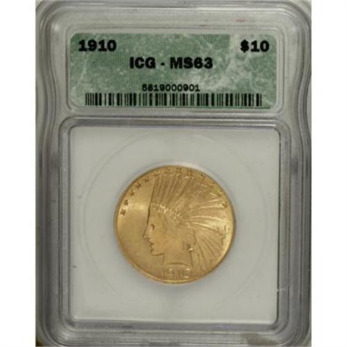 <B>1910 $10 MS63 ICG.</B></I> NGC Census: (538/393). PCGS Population (559/234). Mintage: 318,500. Numismedia Wsl. Price for NGC/PCGS coin in MS63: $2,050. (#8865)<BR><BR><B>Coin Engraver:</B> Augustus Saint-Gaudens<BR><BR><b>Shipping:</b> Coins & Currency (<a target="_blank" href="http://www.heritageauctions.com/common/shipping.php">view shipping information</a>)
