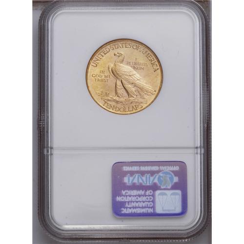 <B>1910 $10 MS63 NGC.</B></I> Frosty luster abounds over each side of this boldly defined example. The matte-like surfaces reveal a few mild marks and a bewitching combination of pink, green, and golden toning.