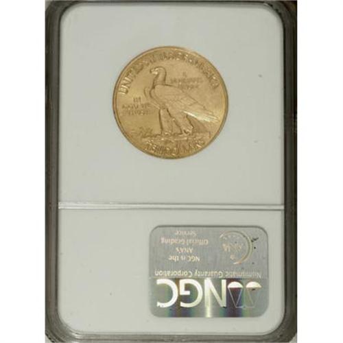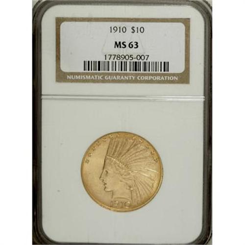 <B>1910 $10 MS63 NGC.</B></I> This is a highly attractive Select Mint State example that exhibits the fine grain surface textures that are typical for this early issue. The cartwheel luster is especially rich on the reverse, and both sides are adorned with pleasing honey-gold coloration. The left obverse has a few abrasions.<BR><BR><B>Coin Engraver:</B> Augustus Saint-Gaudens<BR><BR><b>Shipping:</b> Coins & Currency (<a target="_blank" href="http://www.heritageauctions.com/common/shipping.php">view shipping information</a>)