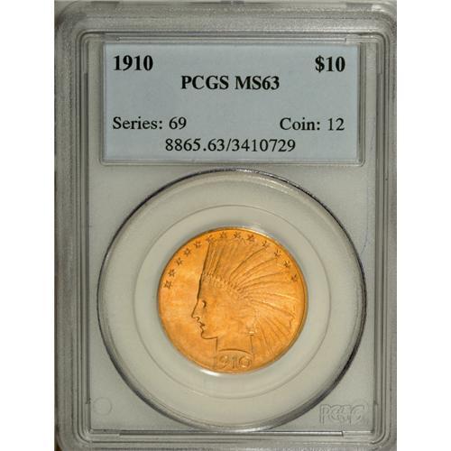 <B>1910 $10 MS63 PCGS.</B></I> Full mint bloom graces this coins obverse and reverse with a minimum of marks. A hint of russet-gold toning enhances the eye appeal on the obverse.<BR><BR><b>Shipping:</b> Coin/Currency (<a target="_blank" href="http://www.heritageauctions.com/common/shipping.php">view shipping information</a>)