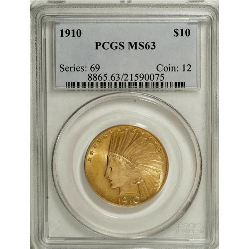 <B>1910 $10 MS63 PCGS.</B></I> The striking details are unusually crisp on this Select example, especially on the headdress feathers. The bright yellow-gold toning is imbued with faint lime accents on each side. Matte-like and highly lustrous, this is a lovely Indian Head eagle with few marks.<BR><BR><b>Shipping:</b> Coins & Currency (<a target="_blank" href="http://www.heritageauctions.com/common/shipping.php">view shipping information</a>)