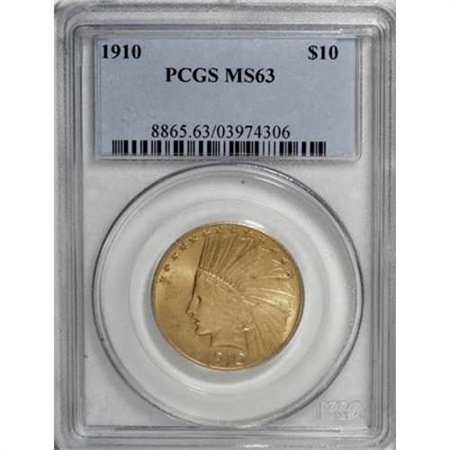 <B>1910 $10 MS63 PCGS.</B></I> A lustrous and impeccably unabraded Select gold type coin with blended peach and olive toning. Evenly struck and undeniably attractive.<BR><BR><b>Shipping:</b> Coins & Currency (<a target="_blank" href="http://www.heritageauctions.com/common/shipping.php">view shipping information</a>)