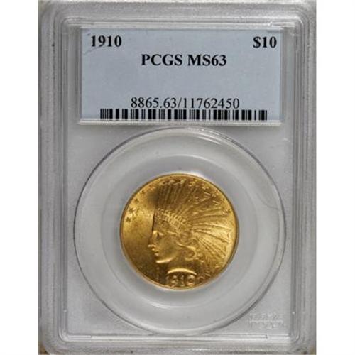 <B>1910 $10 MS63 PCGS.</B></I> PCGS Population (549/233). NGC Census: (535/392). Mintage: 318,500. Numismedia Wsl. Price for NGC/PCGS coin in MS63: $2,050. (#8865)<BR><BR><B>Coin Engraver:</B> Augustus Saint-Gaudens<BR><BR><b>Shipping:</b> Coins & Currency (<a target="_blank" href="http://www.heritageauctions.com/common/shipping.php">view shipping information</a>)