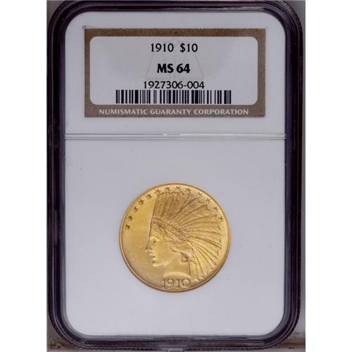 <B>1910<$10> MS64 NGC.</B></I> An eye-catching example with even golden color and nice gentle luster. A few faint imperfections are noted, all exceedingly minor.