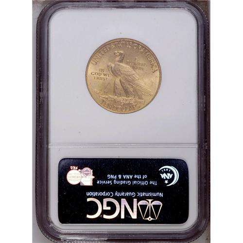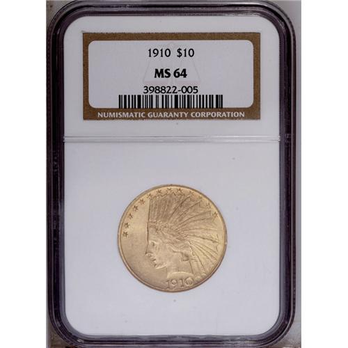 <B>1910 $10 MS64 NGC.</B></I> Crisply struck and only a trifle weak on the eagle's shoulder, with distinctly matte-like surfaces that are frosty and highly effulgent. Lovely orange-gold and mint-green toning is uninterrupted by distracting abrasions on either side of this bright and lovely near-Gem.