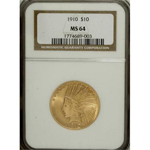 <B>1910 $10 MS64 NGC.</B></I> A strongly lustrous earlier With Motto Saint-Gaudens eagle, well-defined with hints of lemon against the sun-gold of the surfaces. This enticing Choice example has only a few faint ticks on the portrait that keep it from a finer grade.<BR><BR><B>Coin Engraver:</B> Augustus Saint-Gaudens<BR><BR><b>Shipping:</b> Coins & Currency (<a target="_blank" href="http://www.heritageauctions.com/common/shipping.php">view shipping information</a>)