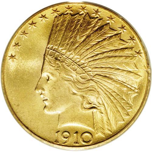 <B>1910<$10> MS64 PCGS.</B></I> Although not the rarest branch mint issue in the Indian eagle series, the 1910-D is a noteworthy find at the near-Gem level. The smooth surfaces more than uphold the respected grade. Nicely struck with solid hair and feather detail. Population: 151 in 64, 59 finer (2/06).