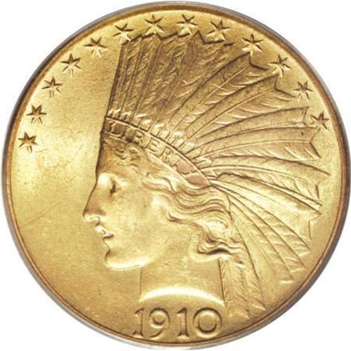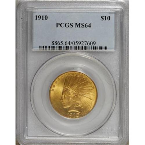 <B>1910 $10 MS64 PCGS.</B></I> Like many Saint-Gaudens eagle issues, the 1910 becomes elusive in Choice and finer grades. The piece offered here has a pleasing level of detail and soft, satiny luster. The green-gold surfaces are well-preserved with no marks worthy of individual mention. An attractive example of this moderate-mintage Philadelphia issue.<BR><BR><B>Coin Engraver:</B> Augustus Saint-Gaudens<BR><BR><b>Shipping:</b> Coins & Currency (<a target="_blank" href="http://www.heritageauctions.com/common/shipping.php">view shipping information</a>\)