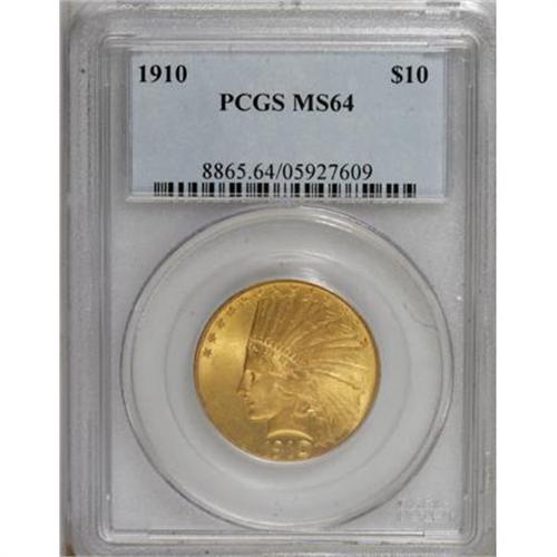 <B>1910 $10 MS64 PCGS.</B></I> Like many Saint-Gaudens eagle issues, the 1910 becomes elusive in Choice and finer grades. The piece offered here has a pleasing level of detail and soft, satiny luster. The green-gold surfaces are well-preserved with no marks worthy of individual mention. An attractive example of this moderate-mintage Philadelphia issue.<BR><BR><B>Coin Engraver:</B> Augustus Saint-Gaudens<BR><BR><b>Shipping:</b> Coins & Currency (<a target="_blank" href="http://www.heritageauctions.com/common/shipping.php">view shipping information</a>)