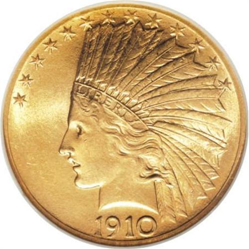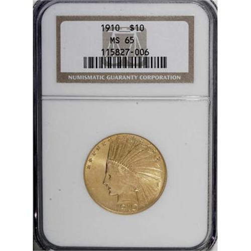 <B>1910 $10 MS65 NGC.</B></I> Rich orange-yellow toning graces this exceptionally smooth and lustrous Gem. The strike is intricate, with any incompleteness limited to a few feathers on the front wing. While the 1910-D has a mintage of more than 2.3 million pieces, the 1910 was limited to a much smaller emission of 318,500 coins.<BR><I>From The Belle Glade Collection, Part Two.</B></I><BR><BR><B>Coin Engraver:</B> Augustus Saint-Gaudens<BR><BR><b>Shipping:</b> Coins & Currency (<a target="_blank" href="http://www.heritageauctions.com/common/shipping.php">view shipping information</a>\)