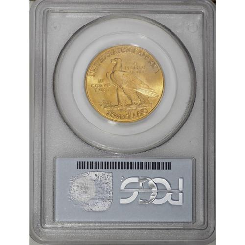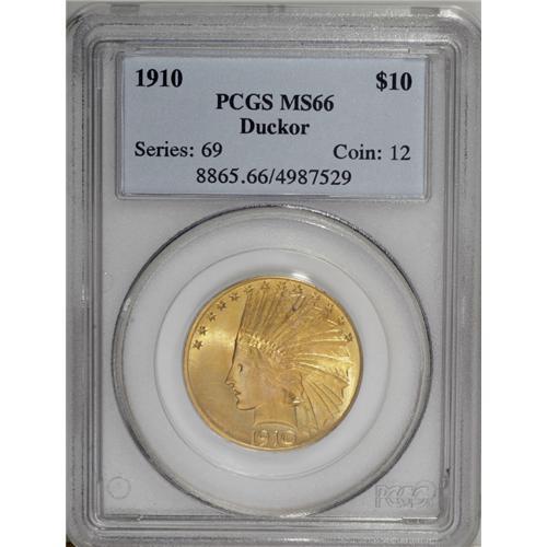 <B>1910 $10 MS66 PCGS.</B></I> The 1910 eagle, with a mintage of 318,000 business strikes, is among the most common issues of the Indian Head ten dollar series. With more than 4,000 MS60 to MS64 examples certified by PCGS and NGC, Uncirculated coins are well within the reach of most collectors. On the other hand, full Gems, with 120 or so having been certified, are more of a challenge. Close to 40 MS66 examples, and fewer than 15 Superb Gems round out the Mint State population.<BR> The MS66 coin offered here displays outstanding orange-gold color imbued with light green accents. The somewhat frosty and finely granular surfaces yield excellent luster and well executed design elements. A few minor marks on the Indian's cheek and in the lower left reverse field are mentioned solely for accuracy. Population: 14 in 66, 2 finer (10/06).<BR><BR><b>Shipping:</b> Coin/Currency (<a target="_blank" href="http://www.heritageauctions.com/common/shipping.php">view shipping information</a>)