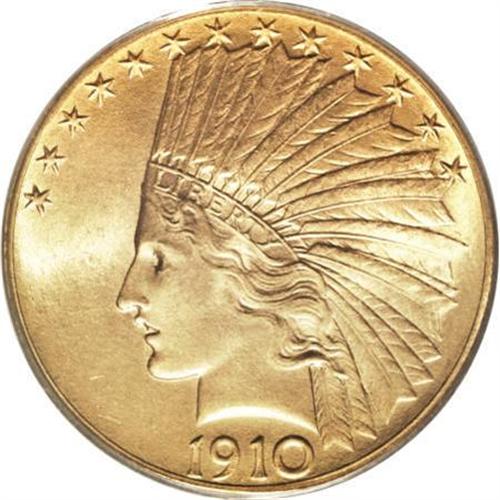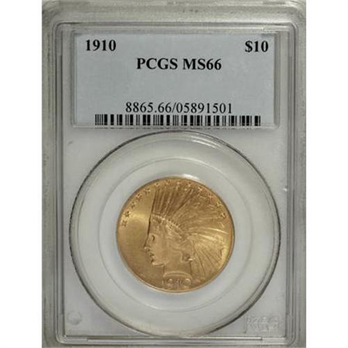 <B>1910 $10 MS66 PCGS.</B></I> Although the mintage of the 1910 eagle was a relatively small 318,500 coins, enough examples were saved that today the issue is available up through the Superb Gem levels. Most of the higher Mint State pieces are, as expected, well-produced, with good luster and a bold strike. The present example is certainly no exception, as brilliant cartwheel luster cascades from the frosty, mattelike orange-gold surfaces. Close perusal with a loupe only confirms the initial impression of premium quality, while revealing a single tick on Liberty's cheek. The coin nonetheless appears high-end for the assigned grade. Population: 17 in 66, 2 finer (3/08).<BR><BR><B>Coin Engraver:</B> Augustus Saint-Gaudens<BR><BR><b>Shipping:</b> Coins & Currency (<a target="_blank" href="http://www.heritageauctions.com/common/shipping.php">view shipping information</a>)