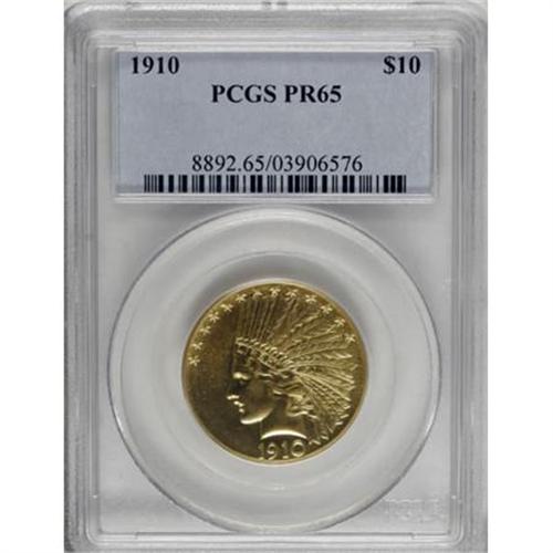 <B>1910 $10 PR65 PCGS.</B></I> The mintage of the 1910 proof Saint-Gaudens eagle issue, comparatively high for the series at 204 pieces, bears little relation to its actual availability in today's numismatic climate. Garrett and Guth (2006) rate the 1910 as one of the most challenging Saint-Gaudens eagle proofs, claiming that " ... the 1910 issue rates as the second-rarest date of the eight Proof dates that are generally available to collectors ... " In the entry for this issue in <I>The Coinage of Augustus Saint-Gaudens as Illustrated by the Phillip H. Morse Collection</B></I>, the authors state that " ... in light of how few examples are known today, either the mintage was recorded incorrectly or most were melted as unsold." Given the state of knowledge about Mint record-keeping and other practices, both explanations seem plausible.<BR> The regular proof issue for this year was made in the so-called "Roman Gold" finish, which combines subtle granularity with a measure of brilliance. Opposition to this hybrid texture, which lent the coins neither the appearance of matte proofs nor the reflective sheen of brilliant proofs, was so strong that the American Numismatic Association, at its 1910 convention, passed a resolution stating a preference for the matte proofs of 1908!<BR> However unpopular the Roman proofs might have been at the time, today, collectors recognize them as part of a short, yet fascinating chapter in American numismatic history. This lemon-gold example, while graded PR65, offers eye appeal that is far better than the norm. Even under magnification, flaws are difficult to detect, and the overall appearance is simply gorgeous. A touch of highpoint softness is trivial in context. Population: 7 in 65, 1 finer (11/07).<BR><BR><B>Coin Engraver:</B> Augustus Saint-Gaudens<BR><BR><b>Shipping:</b> Coins & Currency (<a target="_blank" href="http://www.heritageauctions.com/common/shipping.php">view shipping information</a>)