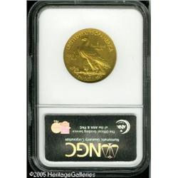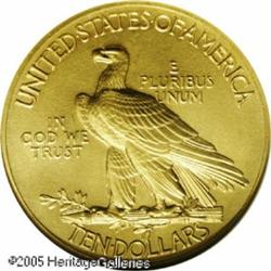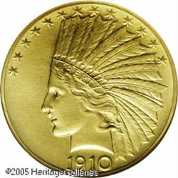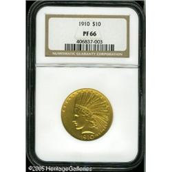 <B>1910 $10 PR66 NGC.</B></I> Like the other three matte proof gold issues of 1910, the mintage of the Eagle for this year is suspiciously large. It was recorded that 204 proofs were struck of this denomination, but in light of how few examples are known today, either the mintage was recorded incorrectly or most were melted as unsold. Unfortunately, there was not enough collector demand at the time to support such a lofty mintage, and today the 1910 Ten Dollar is one of the rarest of all 20th century U.S. gold issues. The literature for this series states that perhaps as few as 15-20 pieces survive today with Akers having only recorded 15 appearances at public auction over a 37-year period. We believe, however, that the actual number of survivors is somewhat higher and estimate that perhaps as many as 30-45 pieces are extant today.<BR> Proofs of this year continue the two-year tradition of using the Roman Gold finish, a hybrid matte and semi-brilliant proofing process that produced beautiful coins, but were all too often confused with business strikes by careless collectors or their heirs. This piece is a little more satiny than the 1909, and minutely deeper and richer in color. The surfaces are nothing less than spectacular with a bright, sparkling finish that is unaffected by even the tiniest impairments. The coin is identifiable by a minute spot located to the left of the forehead, another near the upper edge at the midpoint of the eagle's plumage, and a tiny line in the obverse field near stars 1 and 2. Given three blows from the dies to completely bring up the design, all details are finely replicated and of the sharpest quality. A first-rate specimen of this beautiful, two-year proofing process. Population: 8 in 66, only 4 finer (1/05). Lot:8910