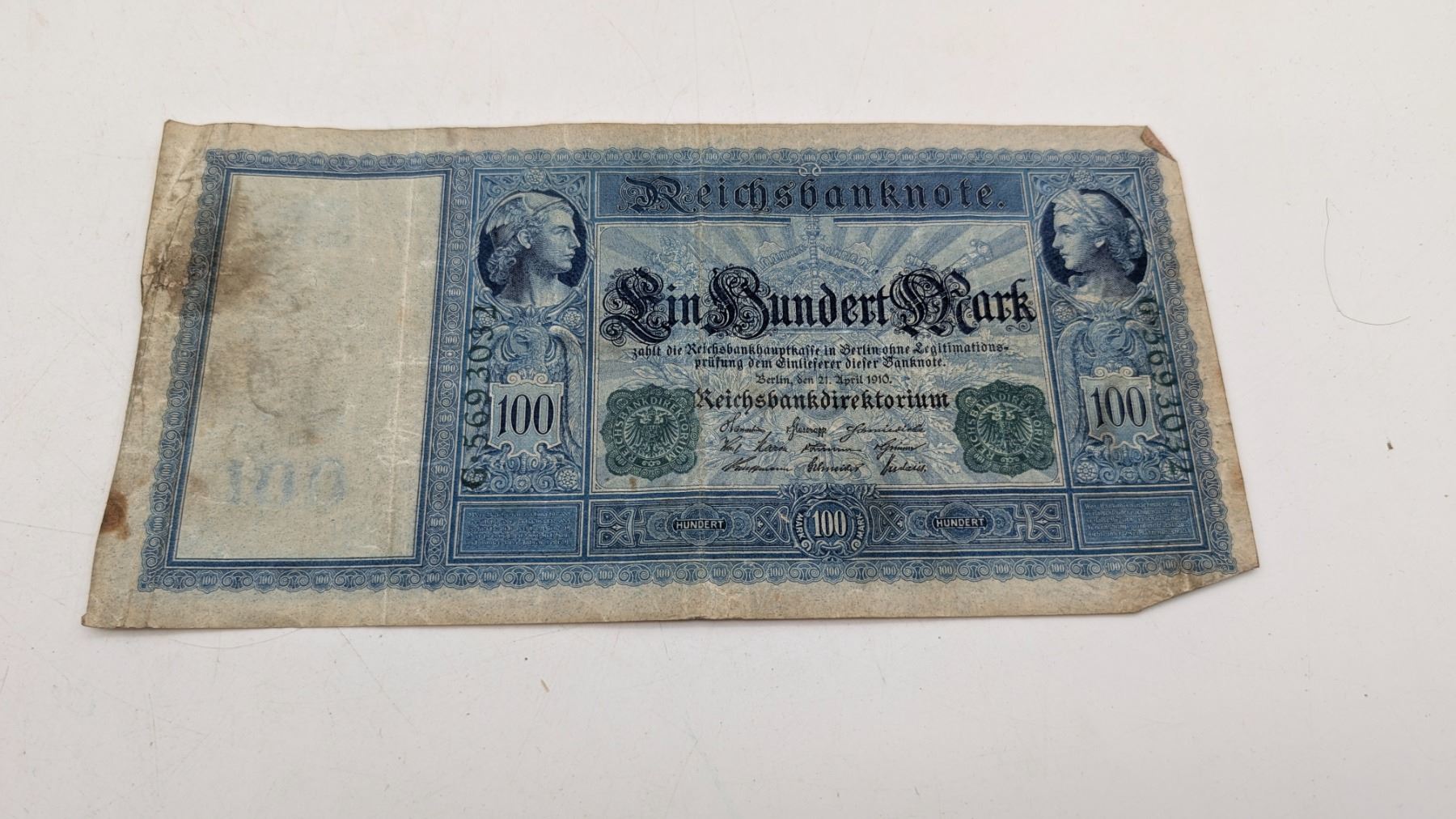 This is a 100 Mark banknote issued by the Reichsbank, dated April 21, 1910. The Reichsbank was the central bank of the German Empire,