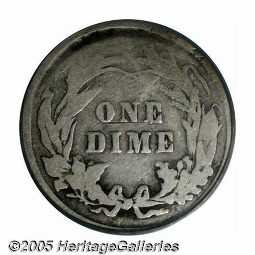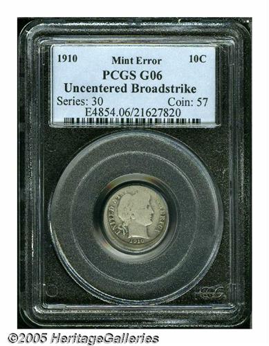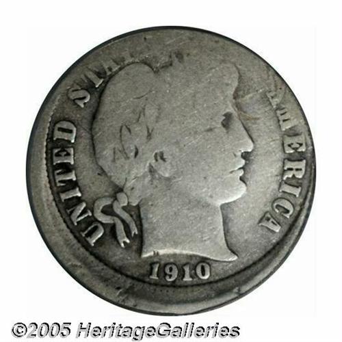 <B>1910<10C> Barber Dime--Uncentered Broadstruck--Good 6 PCGS.</B></I> The area of unstruck metal is widest at 7 o'clock. Several small rim marks are noted on the obverse and an old scratch underlines ONE on the reverse.<BR><I>From The Larry Rausch Collection, Part Five.</B></I>