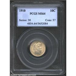 1910 10C MS64 PCGS. This frosty finished survivor is smooth in most areas with an overlay of origina