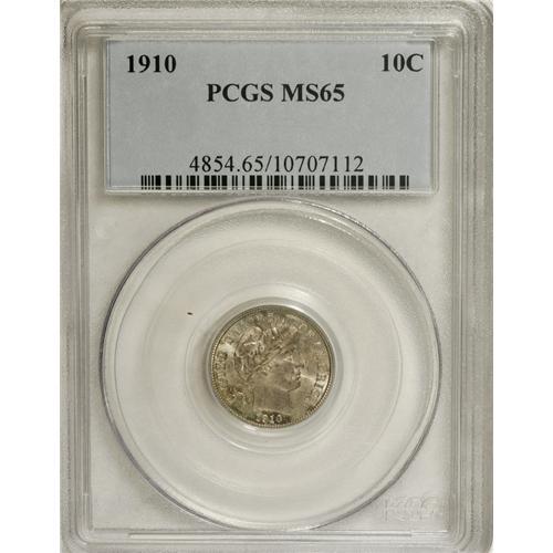 <B>1910 10C MS65 PCGS.</B></I> PCGS Population (49/27). NGC Census: (51/24). Mintage: 11,520,551. Numismedia Wsl. Price for NGC/PCGS coin in MS65: $585. (#4854)<BR><BR><b>Shipping:</b> Coins & Currency (<a target="_blank" href="http://www.heritageauctions.com/common/shipping.php">view shipping information</a>)