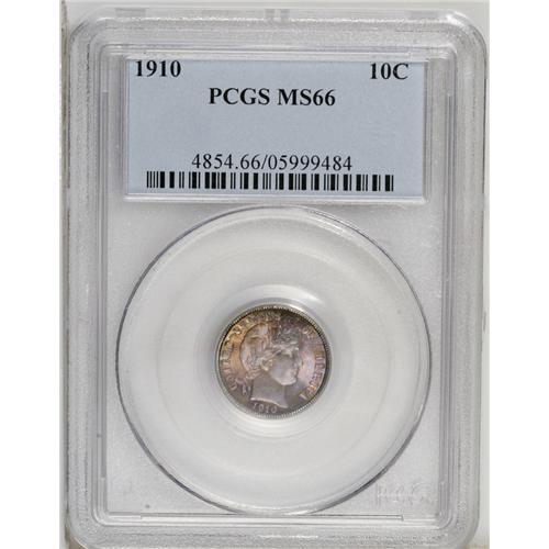 <B>1910 10C MS66 PCGS.</B></I> Vivid violet-rose and orange patina graces this well-preserved piece. An excellent candidate for a 20th-century type set. Population: 17 in 66, 10 finer (10/06).<BR><BR><b>Shipping:</b> Coin/Currency (<a target="_blank" href="http://www.heritageauctions.com/common/shipping.php">view shipping information</a>)