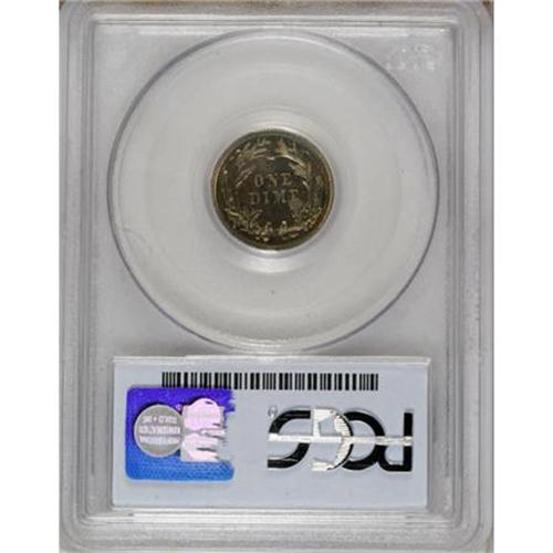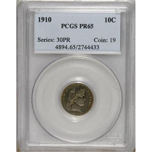 <B>1910 10C PR65 PCGS.</B></I> Medium-intensity cobalt-blue and rose-brown toning bathes each side. A couple of dark toning spots are also noted on each side. The surfaces are free of mentionable contact marks, and exhibit sharply defined design elements. Population: 25 in 65, 19 finer (4/07). <BR><BR><b>Shipping:</b> Coins & Currency (<a target="_blank" href="http://www.heritageauctions.com/common/shipping.php">view shipping information</a>)