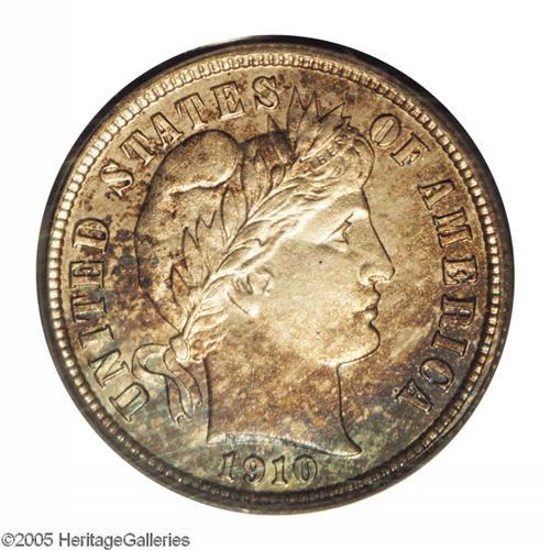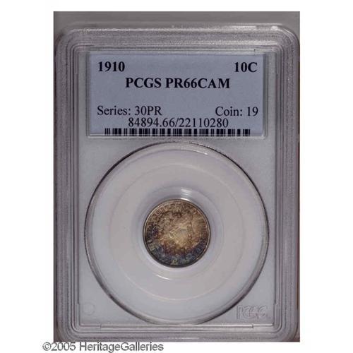 <B>1910<10C> PR66 Cameo PCGS.</B></I> Mottled multicolored toning occurs on the obverse, while the reverse reveals a hint of milky-tan color. This specimen is seemingly free of significant marks although a black spot is noted on the N of ONE on the reverse. Population: 3 in 66, 2 finer (11/05).