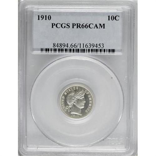 <B>1910 10C PR66 Cameo PCGS.</B></I> The 1910 issue of the proof Barber dime had a scant mintage of 510 pieces, among the lowest of the series. This is a lovely cameo Gem that has a razor-sharp strike and virtually pristine surfaces. A wonderful candidate for a high quality proof type set. Population: 3 in 66 Cameo, 2 finer (6/07).<BR><BR><b>Shipping:</b> Coins & Currency (<a target="_blank" href="http://www.heritageauctions.com/common/shipping.php">view shipping information</a>\)