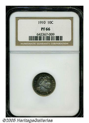 <B>1910<10C> PR66 NGC.</B></I> Luminous proof surfaces are visited by cobalt-blue, golden-brown, and lavender patina around the borders. The design elements are exquisitely struck, and there are no mentionable marks to report. Only 551 proofs were struck in 1910. NGC and PCGS have certified a total of 34 specimens in PR66, and 24 finer (4/05).