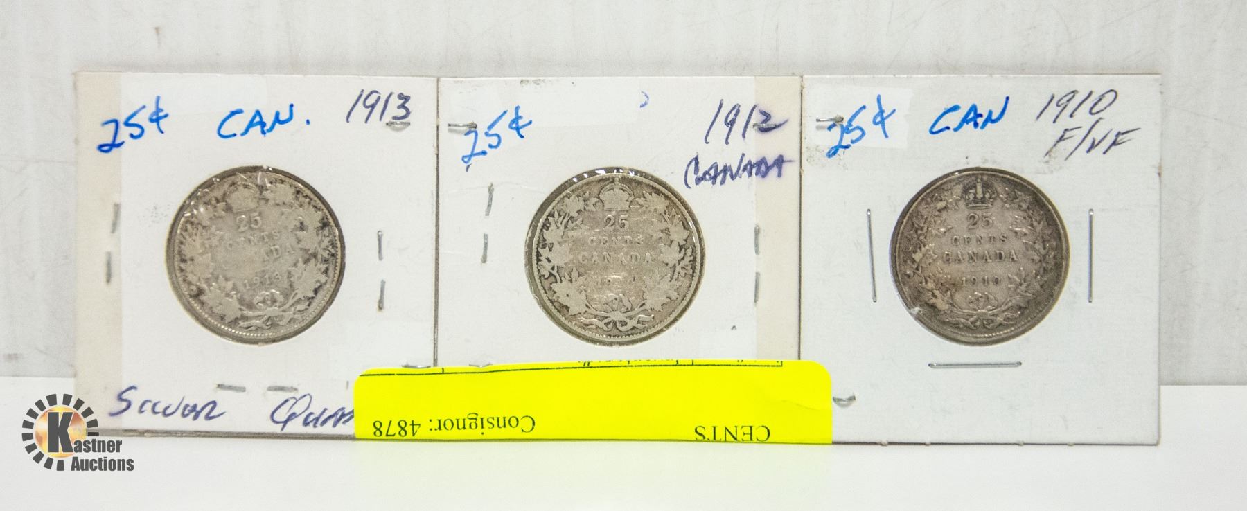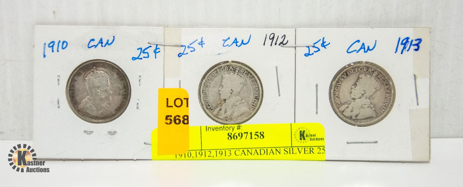 1910,1912,1913 CANADIAN SILVER 25 CENTS